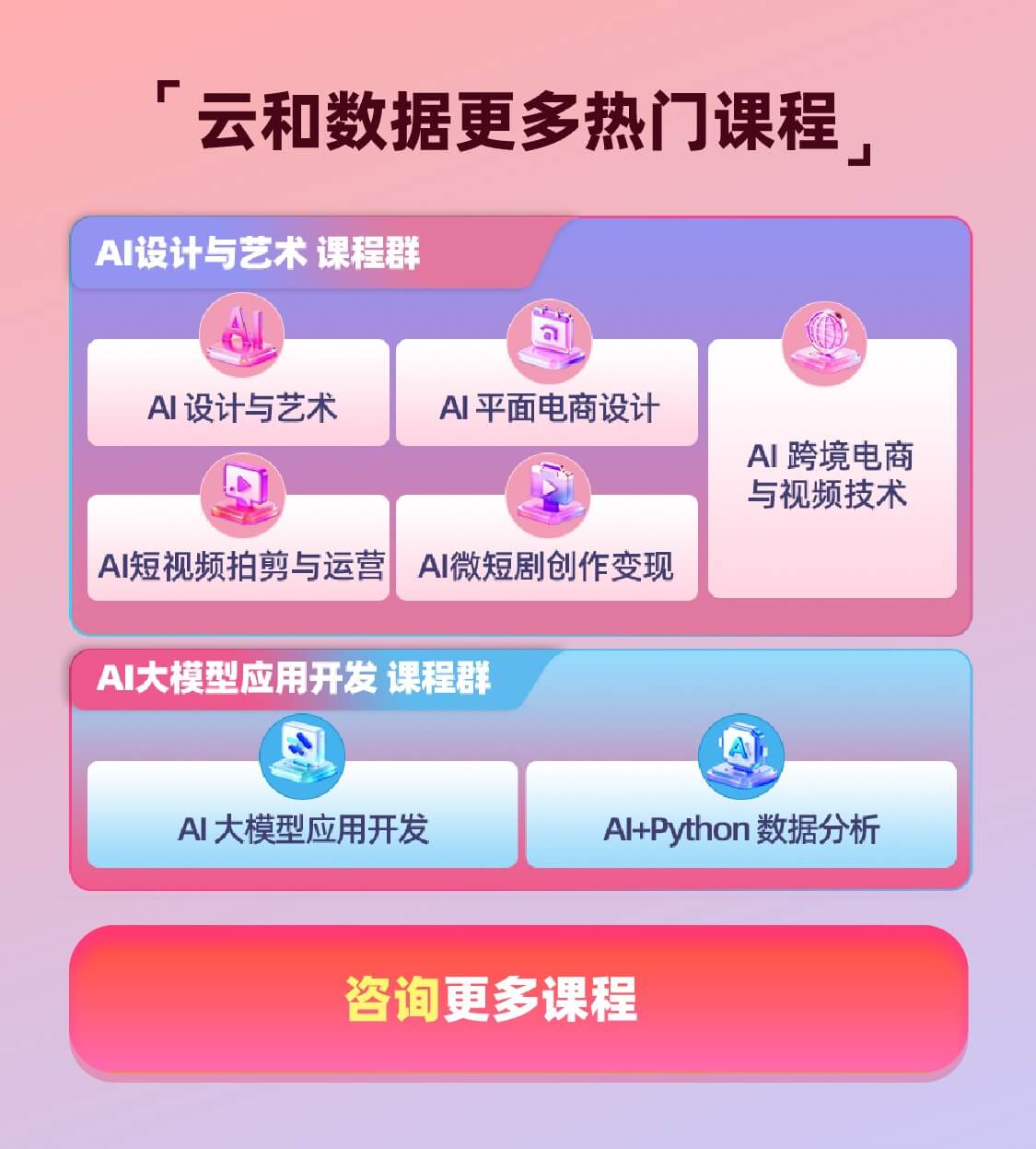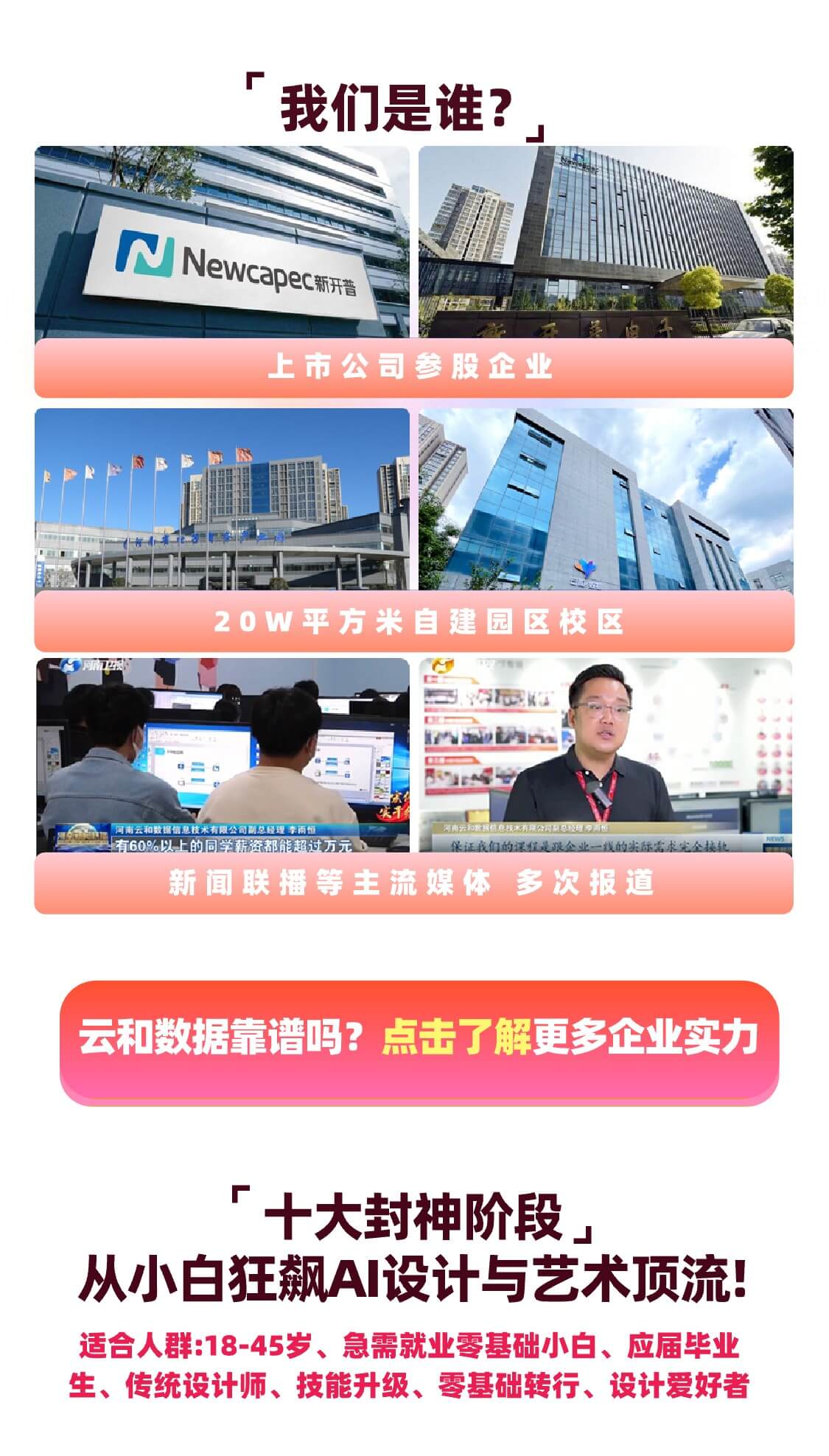 UI工作流等AI工具的应用。Photoshop和Illustrator的基础操作、掌握图像编辑、合成和矢量图绘制的基本技能、品牌IP视觉打造、LOGO设计、海报设计、包装设计、、商品的的精修、公众号设计、营销页面设计、熟练运用AI技术提升产品美感,增强吸引力